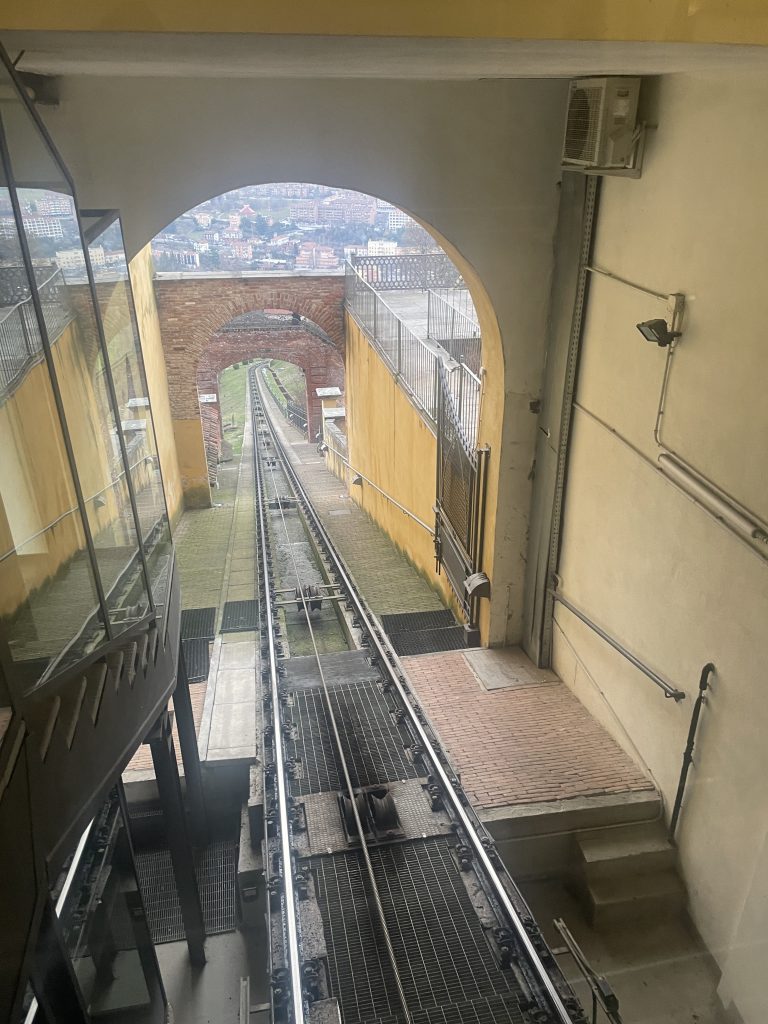 Le funiculaire fonctionne avec deux voitures qui se croisent à mi‑parcours sur une voie unique et offrent une vue panoramique sur la ville, la vallée et les collines alentours.