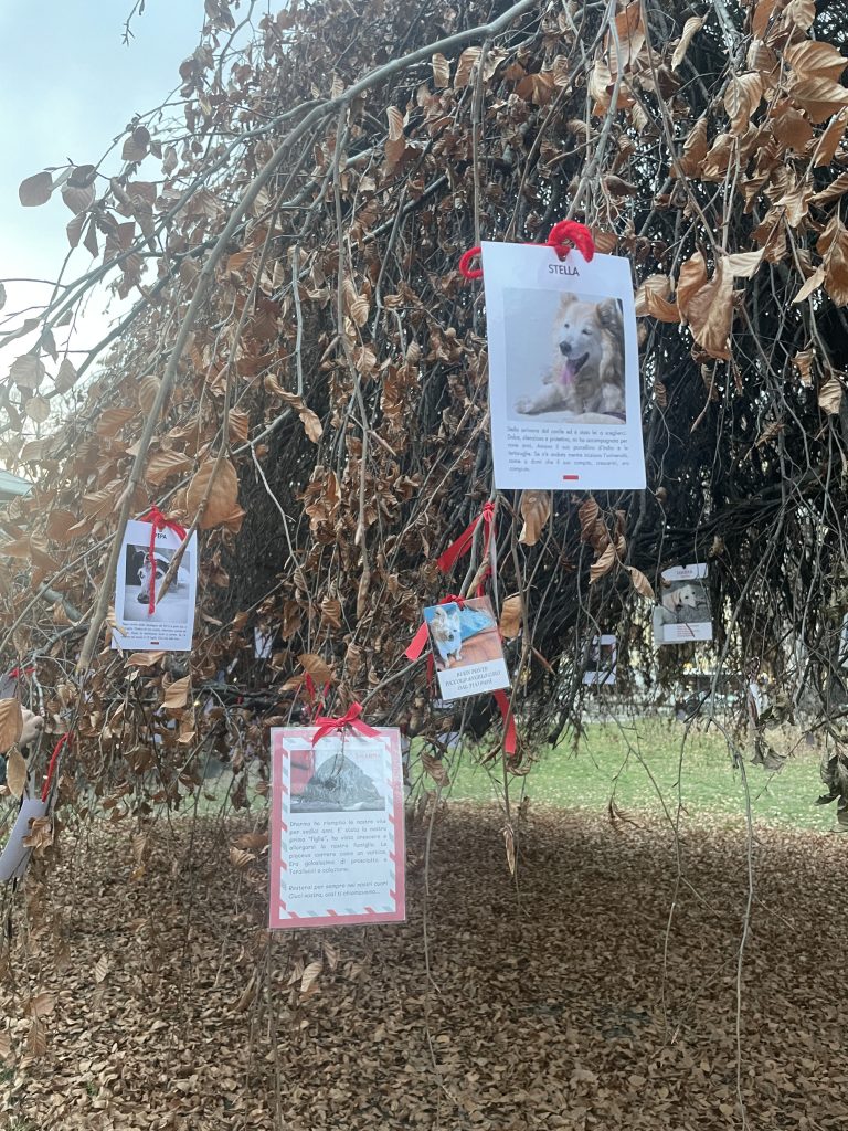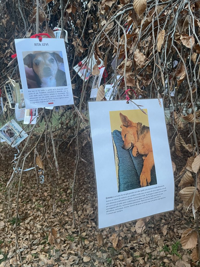 Le mémorial prend la forme d’un arbre de mémoire, sur lequel sont accrochées des photographies de chiens disparus, accompagnées de messages, de prénoms et de mots d’amour. Chaque image raconte une histoire, un lien, une présence qui continue d’exister à travers le souvenir.